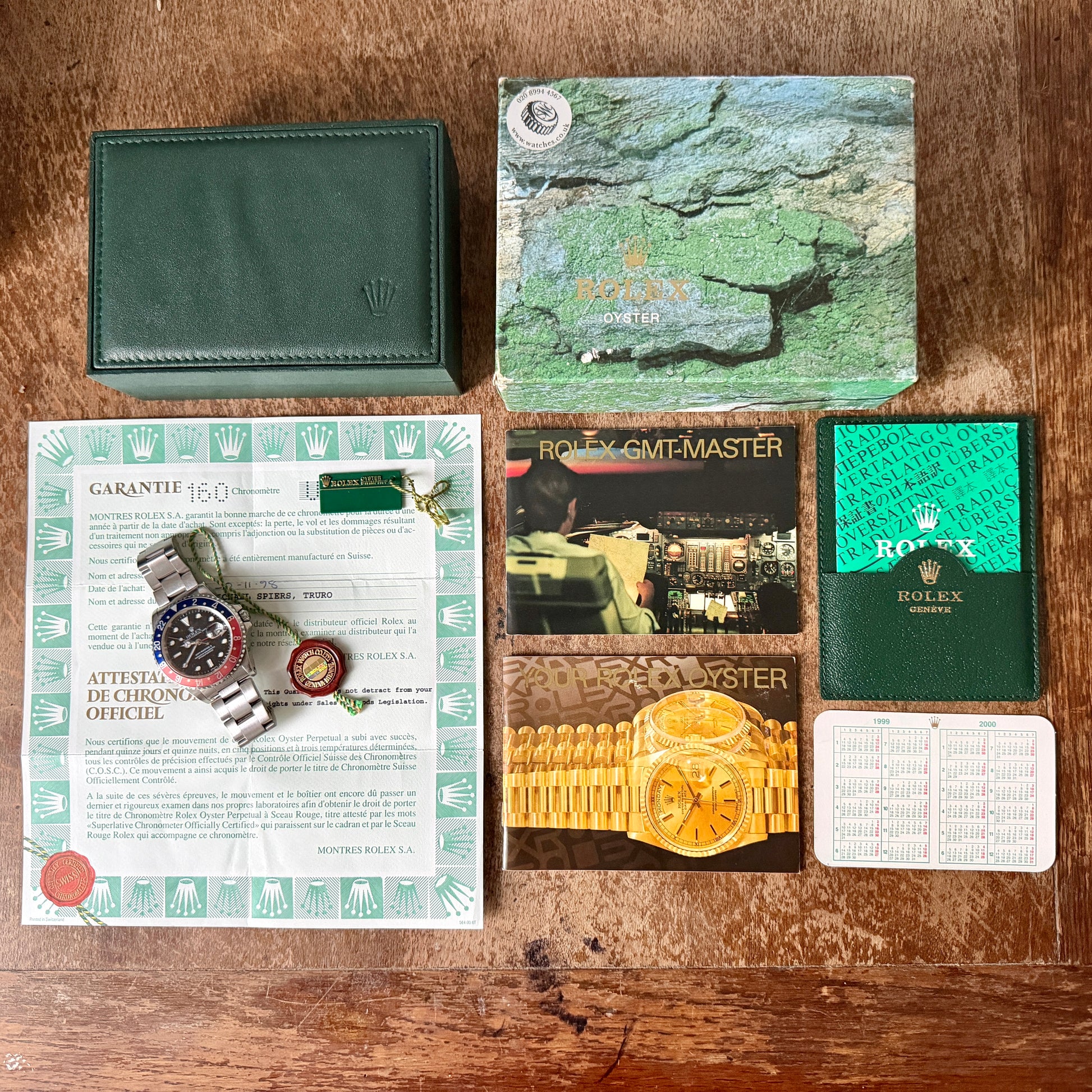 Bought new November 1998 from Michael Spiers in Truo, Cornwall. Full set watch with Original warranty certificate, swing tag, inner and outer boxes, 1999/2000 calendar, GMT Master instructions, Oyster booklet, translation booklet and leatherette booklet holder.